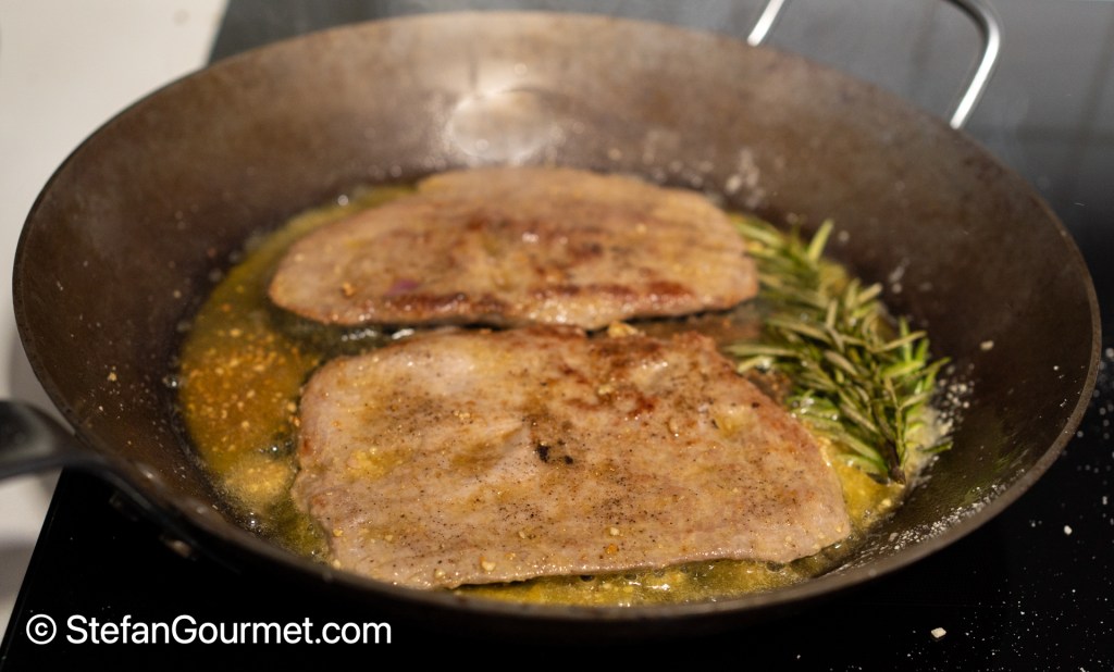 …turning as soon as the scaloppine are golden. They will need only 30-60 seconds because they are so thin. Watch out not to overcook the scaloppine.