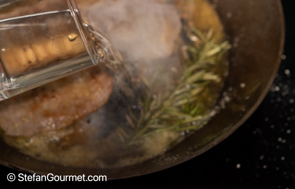 Deglaze the pan with the white wine. Cook over high heat until half of the wine has evaporated, then take the scaloppine out of the pan and plate them (on preheated plates).