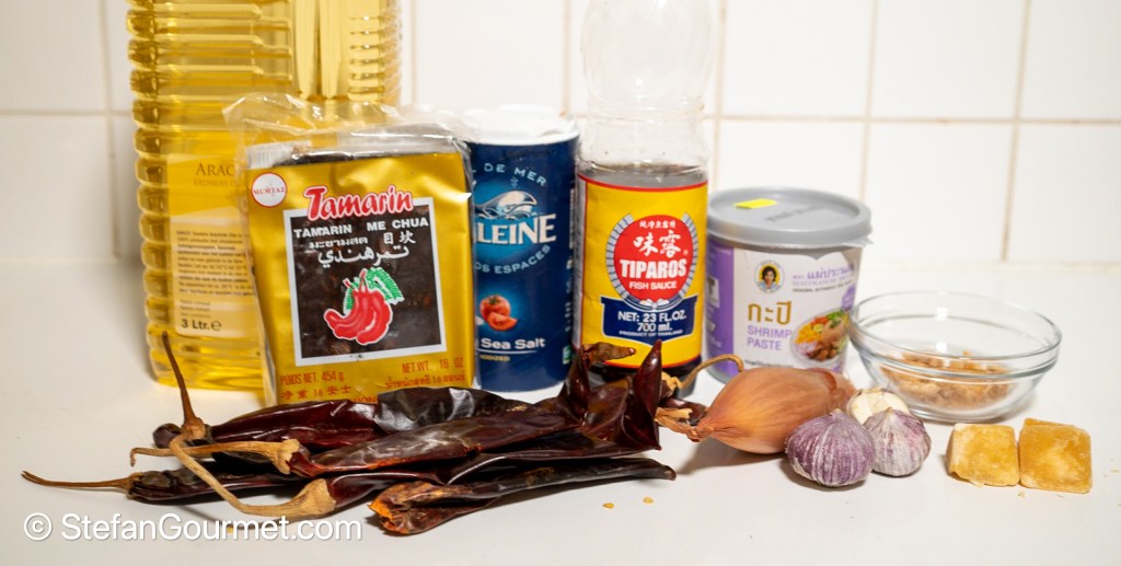 Nam Phrik Phao or Nam Prik Pao is one of the Thai chili pastes. Because of the consistency and containing palm sugar, it is sometimes also referred to as chilli jam. This is not the kind of jam you’d have on a peanut butter and jelly sandwich (although I believe that may actually be quite good). One of the characteristics is that the ingredients are roasted and then sautéed in oil. Like many traditional recipes, there are countless variations. My favorite reliable sources for Thai recipes all use dried red chili, shallots, garlic, tamarind, palm sugar, dried shrimp and shrimp paste. I’ve followed Hot Thai Kitchen’s recipe here.