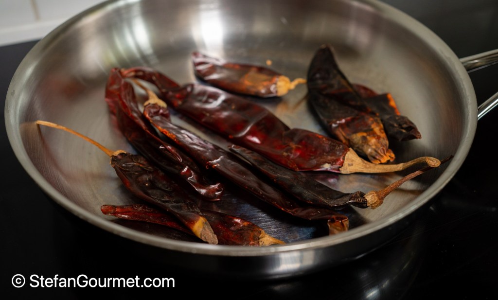 Start by toasting the chiles in a dry frying pan over medium-high heat. They should become soft and fragrant, but should not burn.