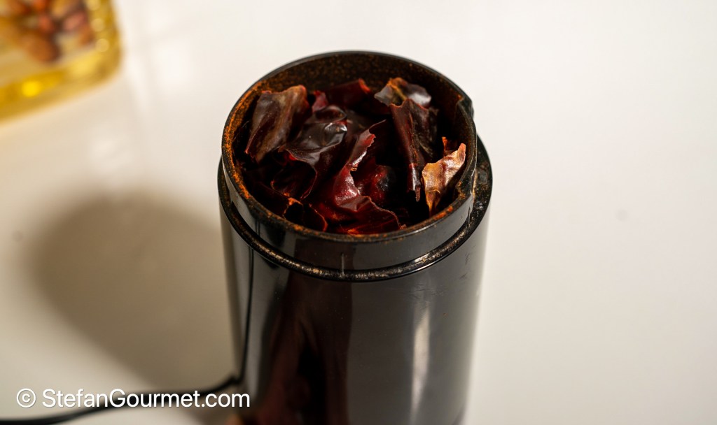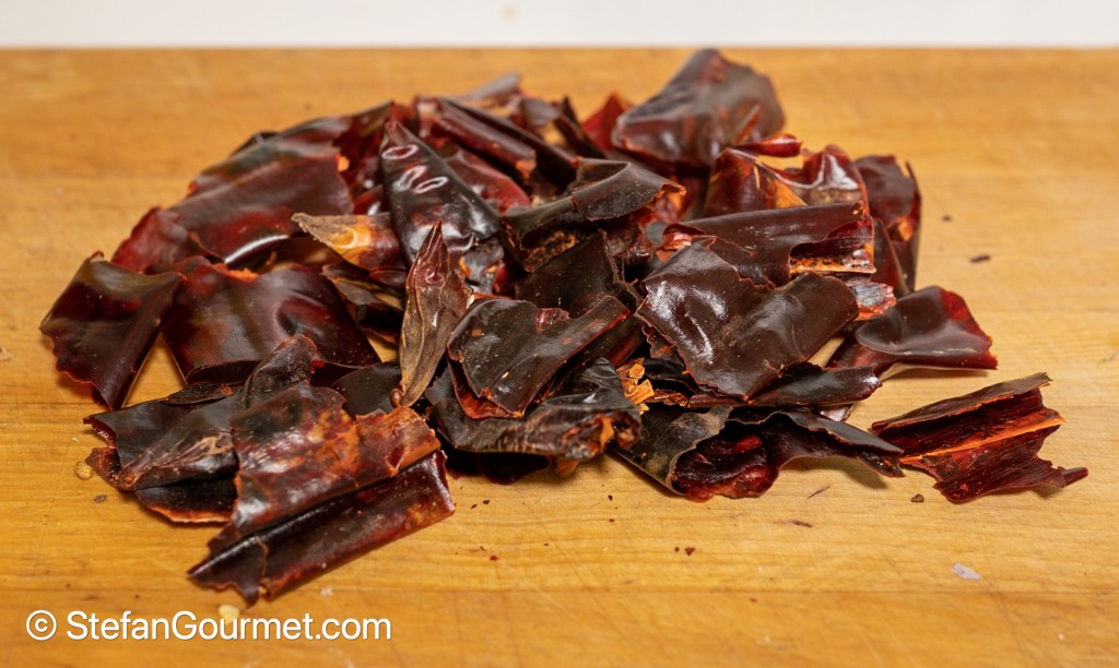 After toasting the chiles, remove the stems and cut them into big pieces with scissors. This makes it easier to remove the seeds. Discard the seeds.