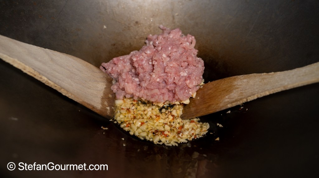 Heat up a wok and add a tablespoon of oil. Then add the minced chillies and stir for a minute.