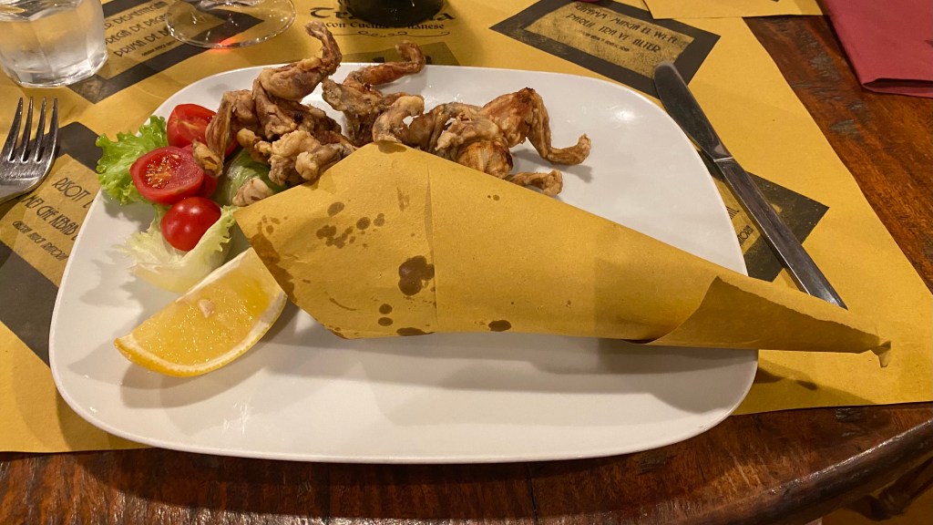 As secondo I had selected deep fried frog legs. They were deep fried in batter, crispy on the outside, and soft on the inside. Frogs are a local ingredient because the frogs are caught in the rice fields where the rice for risotto is cultivated. The frog legs were quite small and had little bones inside, so I had to eat them carefully.