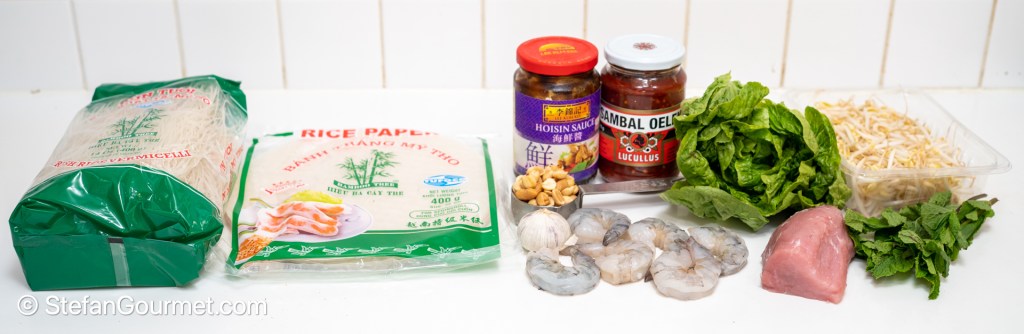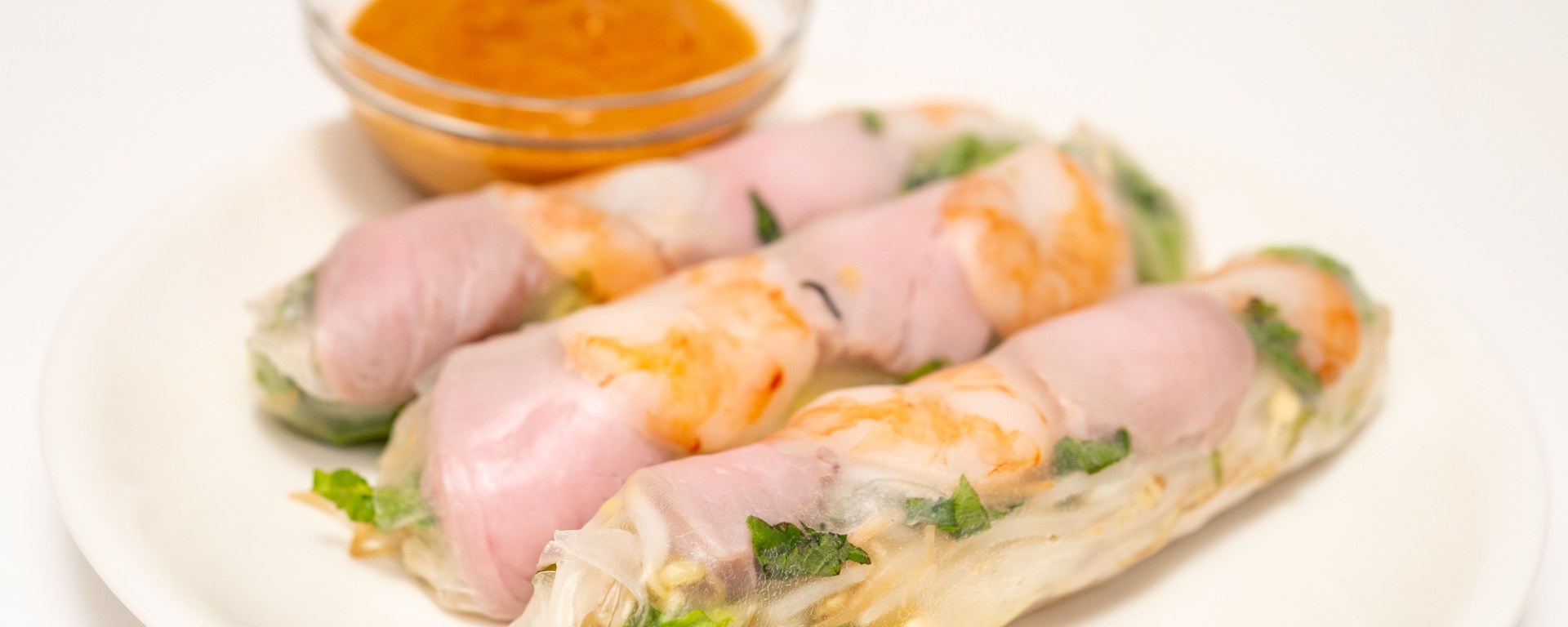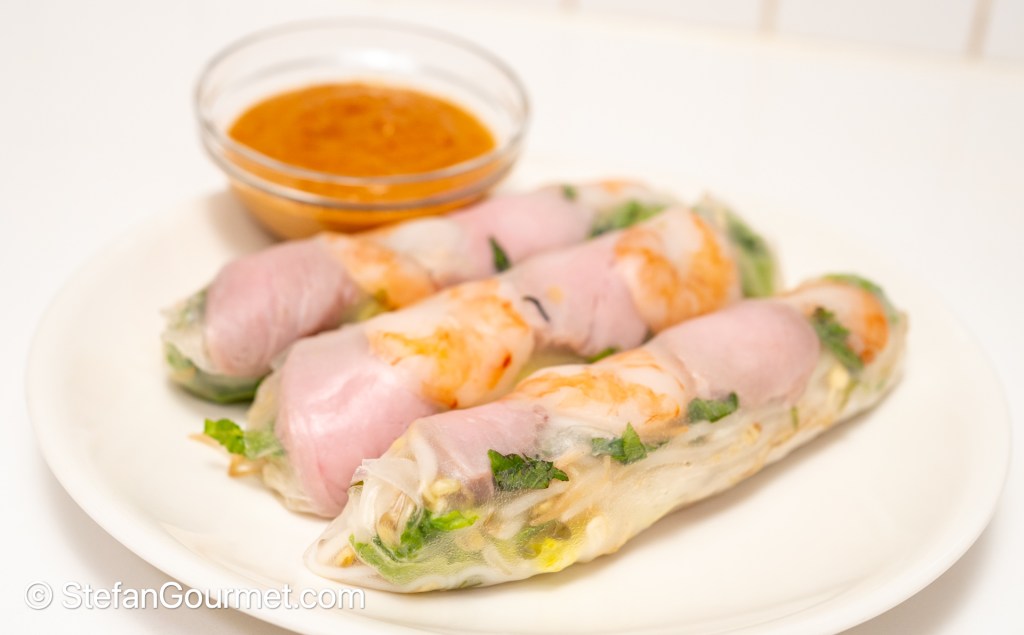 There are two main kinds of Vietnamese spring rolls: deep fried, and ‘uncooked’. The shrimp and meat in those is actually cooked, but otherwise these Vietnamese spring rolls are a fresh appetizer that is served at room temperature. Traditionally the shrimp and pork are boiled in salted water, but they retain more flavor by cooking them sous vide instead. The star of this dish is not the spring roll itself but the peanut dipping sauce.