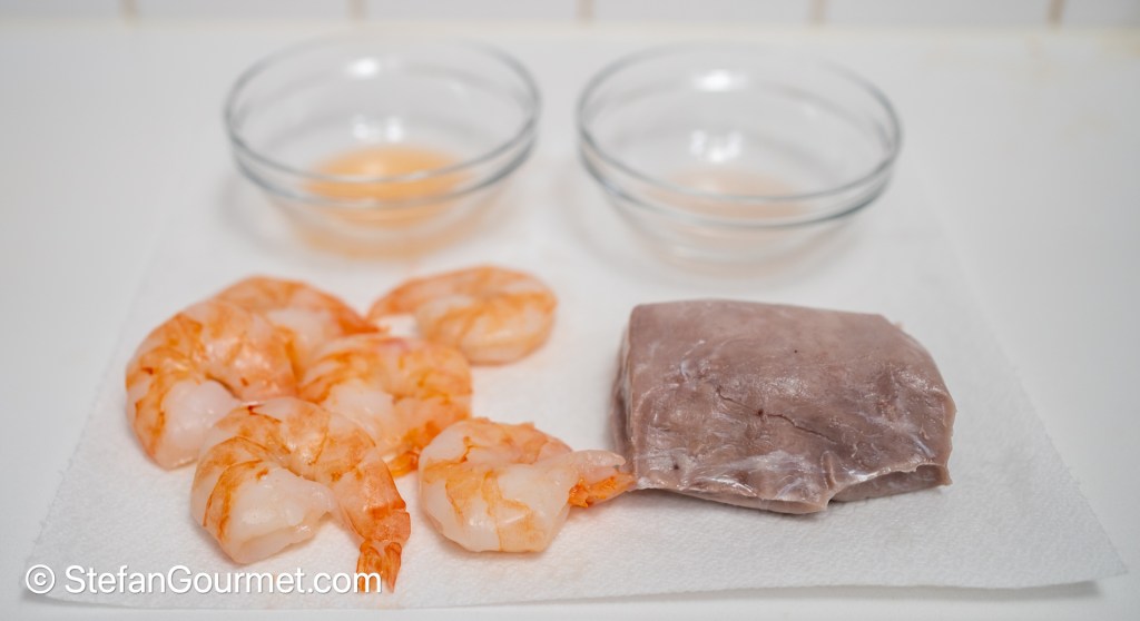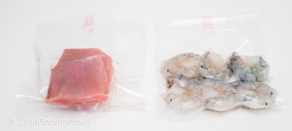 Season the shrimp and pork tenderloin with salt, and vacuum seal.