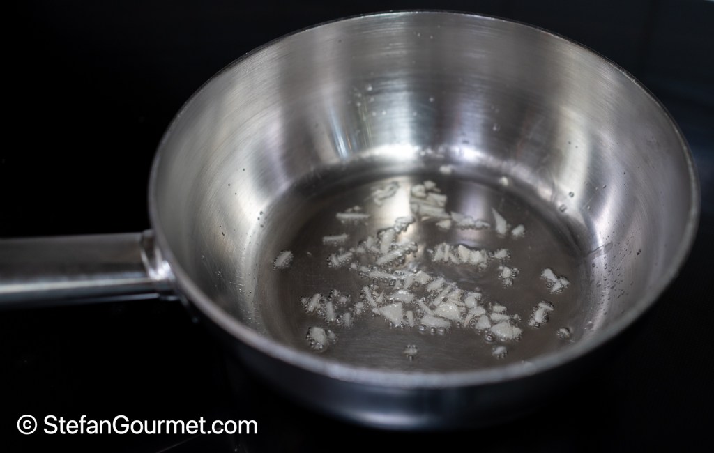 For the dipping sauce, stir a minced garlic clove in a tablespoon of vegetable oil over medium heat until it starts to turn golden, then turn off the heat.