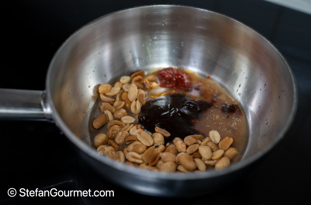 Add 80 grams peanuts, 4 tablespoons hoisin, 1 tablespoon sambal oelek, and the reserved sous vide juices.