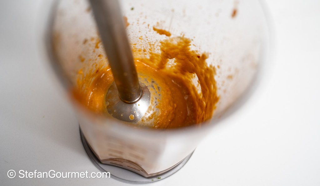 Blend until smooth, adding water to get the desired consistency. If using an immersion blender, it is advisable to transfer the ingredients into a tall container before blending.