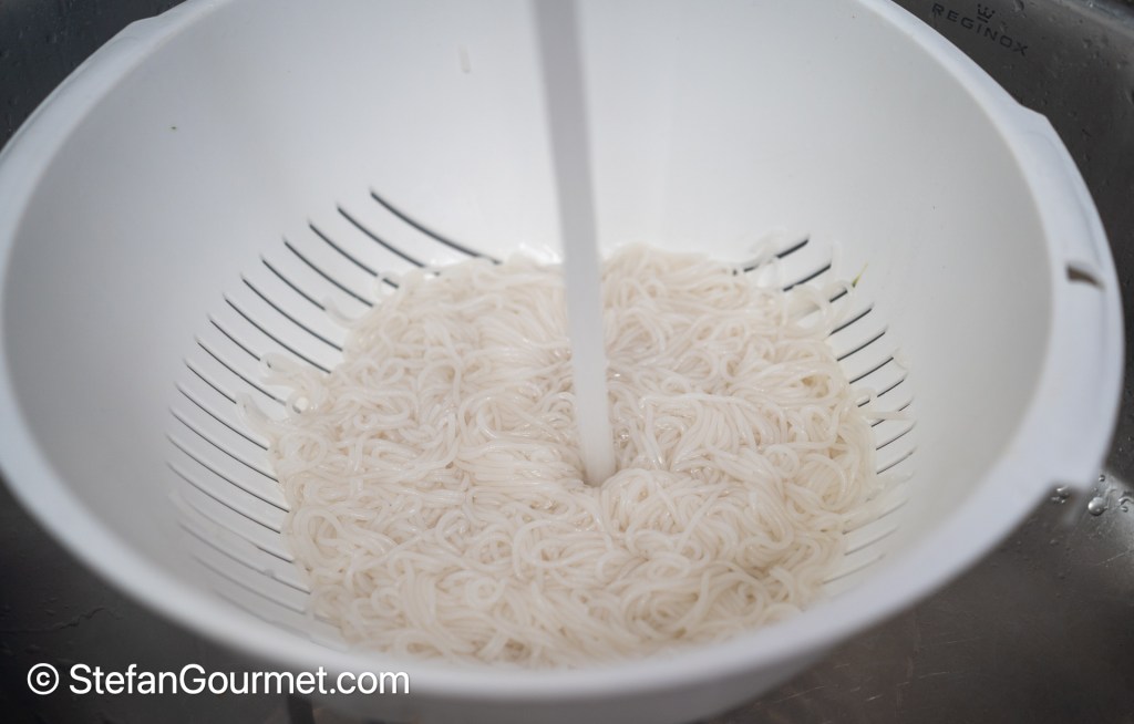 Boil the rice vermicelli in salted water according to package instructions, then drain and rinse with cold running water.