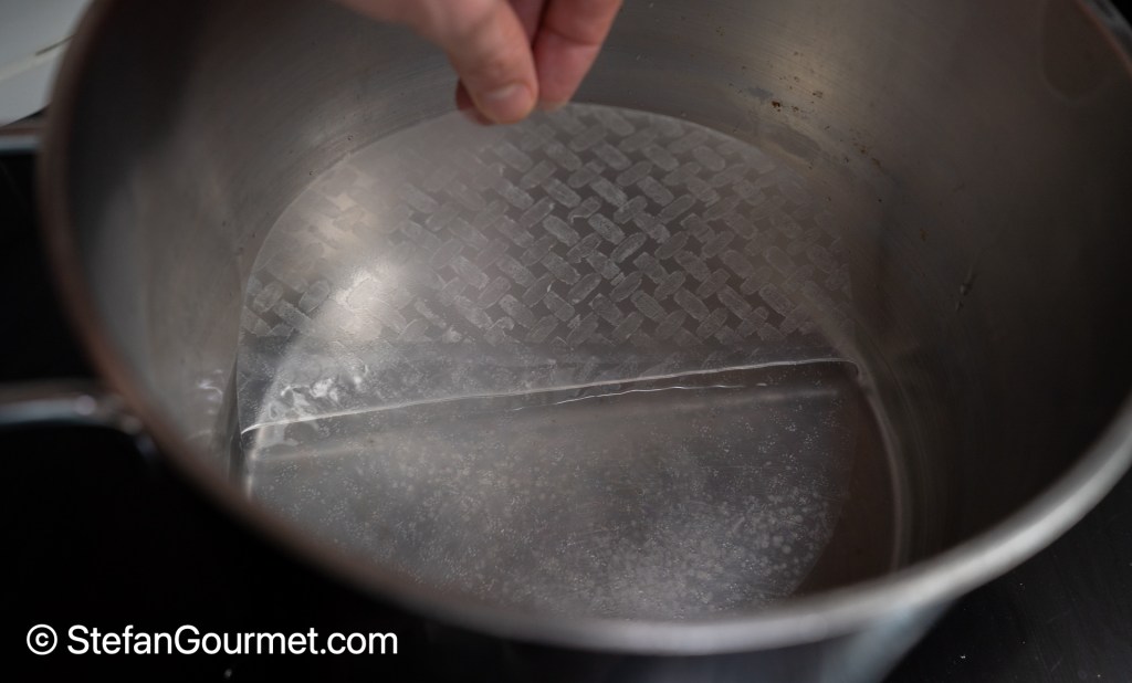 To assemble the spring rolls, start by dipping a sheet of rice paper in hot water for 3 seconds only. The rice paper will continue to become softer after you’ve taken it out of the water, so don’t put it in longer.