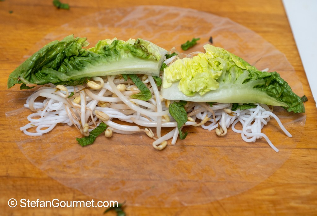 Place a ‘sausage’ of rice vermicelli and bean sprouts on the center of the rice paper. Use 1/8 of the vermicelli and 1/8 of the bean sprouts. Sprinkle with a teaspoon of minced mint. Cover with a leave of lettuce, torn into pieces.