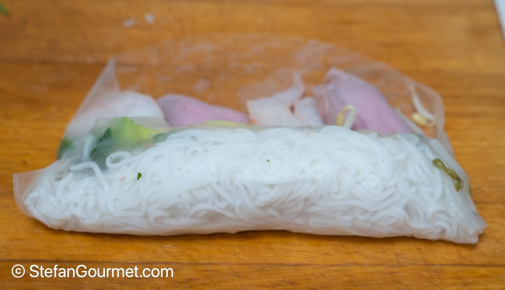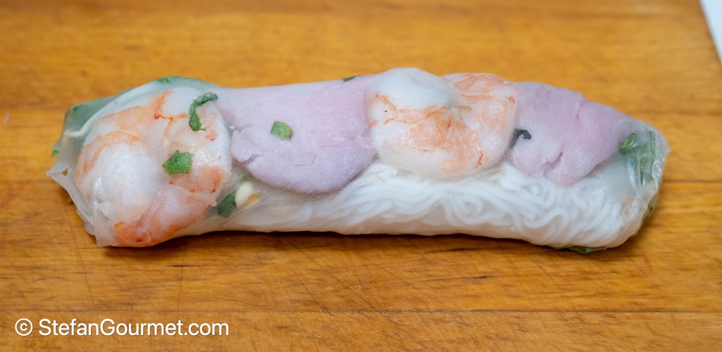 Roll the rice paper tightly around the vermicelli and vegetables until just covered. Then arrange pork and shrimp slices next to the roll, and fold in the sides. Make sure the pretty side of the shrimp faces downwards.