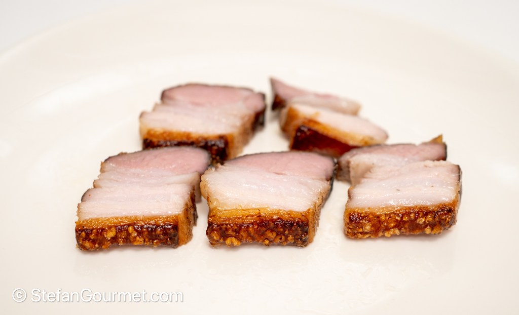 Serve the slices of pork belly on preheated plates, to prevent them from cooling off too quickly.