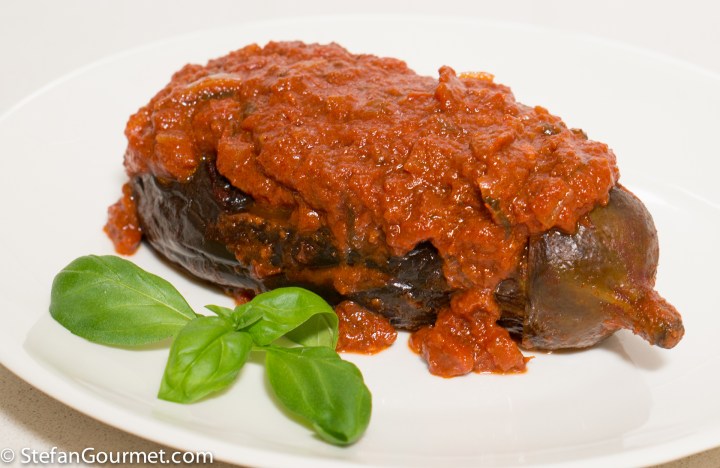 Melanzane abbottonate, or Mulinciani ‘mbuttunati in Sicilian, literally means “buttoned up eggplants”. The slit that is made in the aubergine to insert the filling looks like a button hole. The eggplant is filled with pecorino cheese (preferably caciocavallo from Sicily if you can find it), mint leaves, and garlic, and cooked in a tomato sauce.