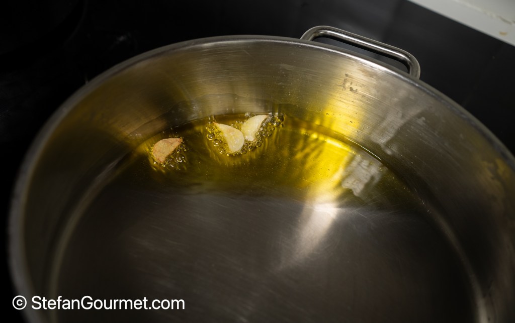 Heat two tablespoons olive oil in a wide shallow thick-bottomed pan. Peel the garlic and slice it thickly. Tilt the pan and gently deep fry the garlic to flavor the oil. The garlic should not become too dark, only golden. Discard the garlic as soon as it is golden.