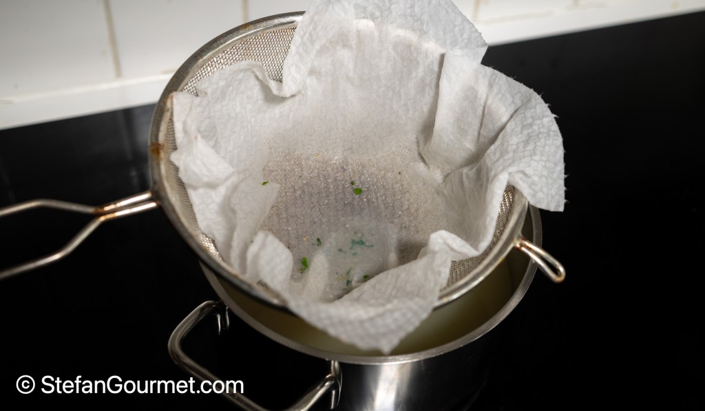 Filter the liquid using kitchen paper and combine it with half a litre of fish stock. Keep the stock hot but not boiling.