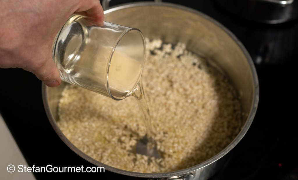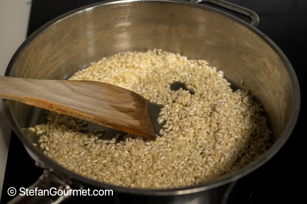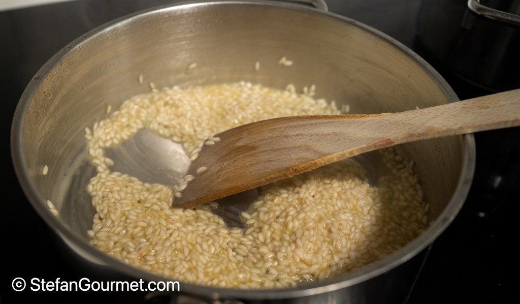 Add 200 grams of risotto rice, and toast it over medium-high heat for a couple of minutes.