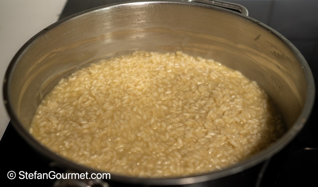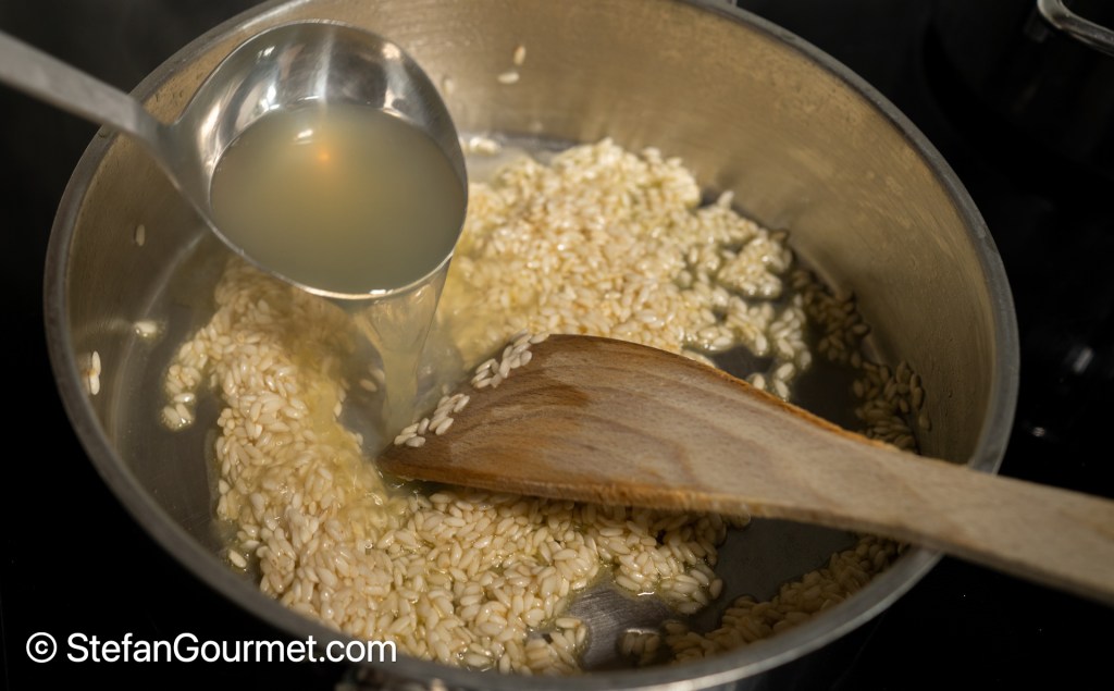 Regulate the heat such that the rice keeps simmering. Stir until the stock has been absorbed, then add the next ladle of stock. Keep stirring and adding stock until the rice is almost al dente, 16 to 18 minutes. You don’t have to stir all the time; it is the most important immediately after adding new stock (to distribute it evenly) and just before adding new stock (because that is the best time to get the rice to release starch). Switch to boiling water if you run out of stock.