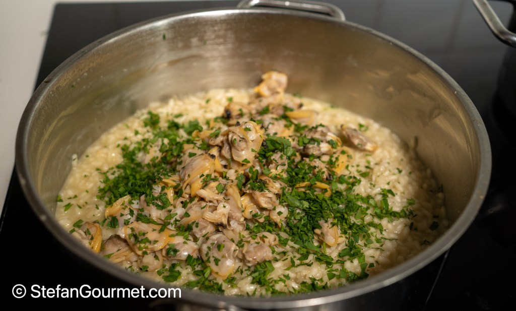 …add the vongole, a tablespoon of minced parsley, and a final ladle of stock.