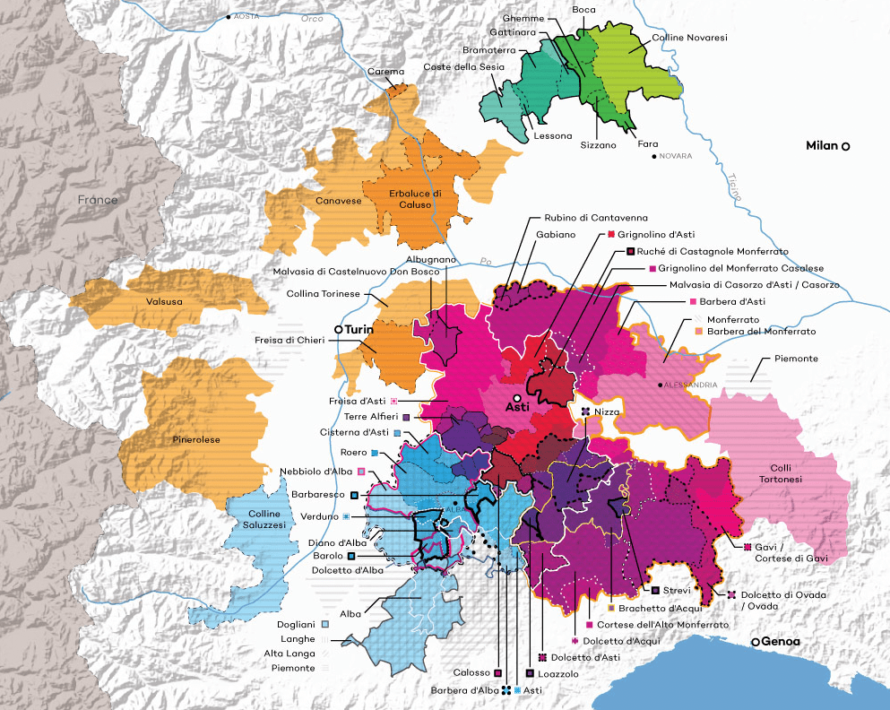 The most famous appellations in this region are Barolo and Barbaresco, with noble wines of Nebbiolo. Other important autochthonous grape varieties in this area are Barbera, Dolcetto, Grignolino, Freisa, Ruché, Pelaverga, and Brachetto for red wine, and Moscato, Arneis, and Favorita (Vermentino) for white wine. Other parts of Piemonte have Cortese, Timorasso, and Erbaluce for white, as well as Bonarda Piemontese and Croatina for red. Apart from this international varieties like Sauvignon Blanc, Chardonnay, Riesling, and Pinot Nero are also used in Piemonte.