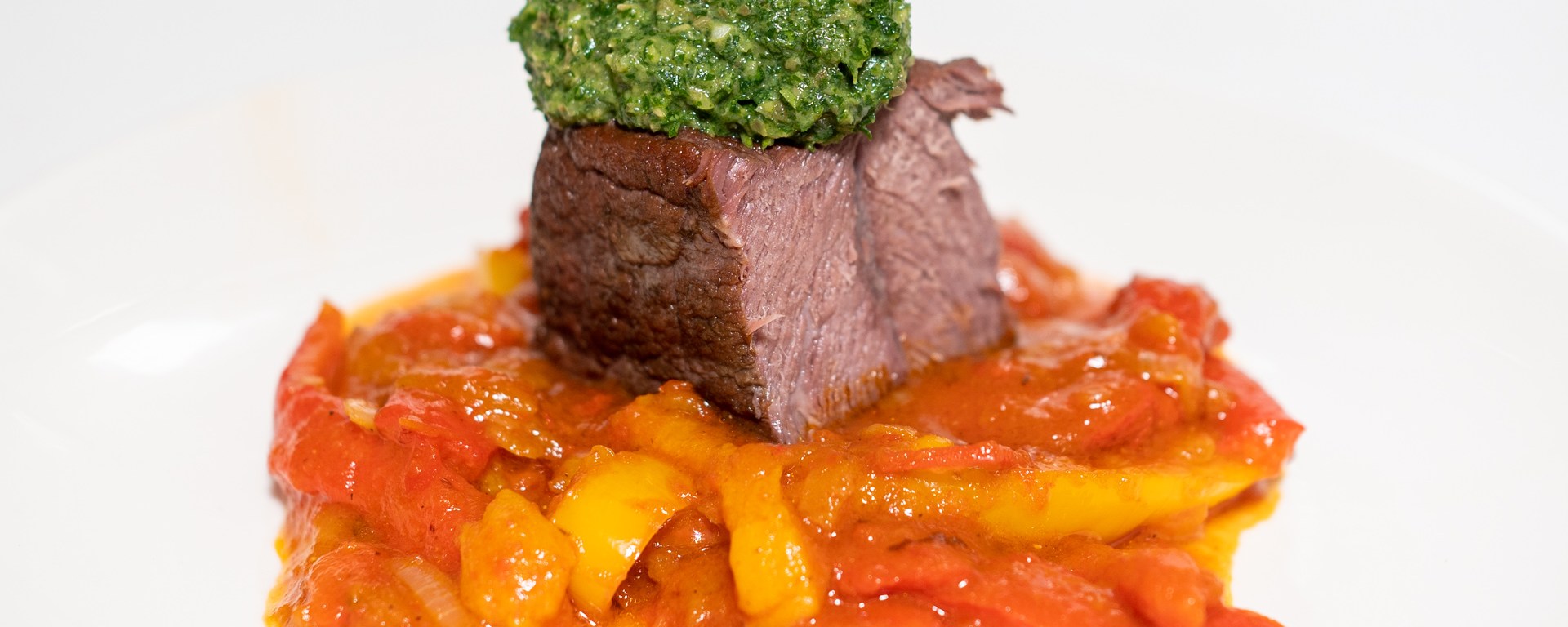 Bollito misto is a classic Italian recipe from Piemonte of boiled meat with various sauces, including salsa verde. At Ristorante Trippi in Valtellina I enjoyed a dish inspired by bollito misto, which was a boiled blade of beef with salsa verde and peperonata. The beef was so tender you could eat it with a spoon, but it didn’t have a strong beefy flavor. That is the problem of boiling meat: a lot of the flavor will end up in the cooking water (as you are basically preparing a stock). But I loved the combination of the beef with the salsa verde and peperonata.