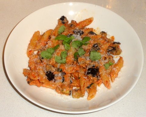 Pasta alla Norma is a dish from Sicily with eggplant in a tomato sauce with sheep’s cheese (ricotta salata). This photo is from the early days of my blog and the dish deserves a better photo. I still prepare it the same, although now I use actual ricotta salata, which I have always in my refrigerator (vacuum sealed it keeps for a very long time).