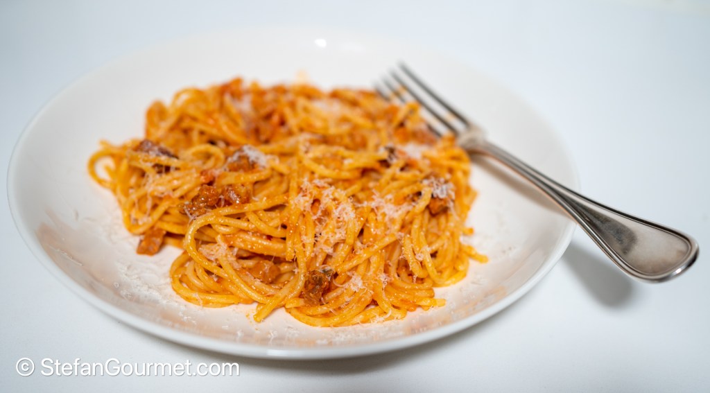 Spaghetti all’Amatriciana is another famous, simple and delicious spaghetti dish from Rome, next to Carbonara and Cacio e Pepe. I prepare it with my homemade pancetta, because guanciale is difficult to come by in the Netherlands (although I have made homemade guanciale). We had this as primo piatto, followed by: