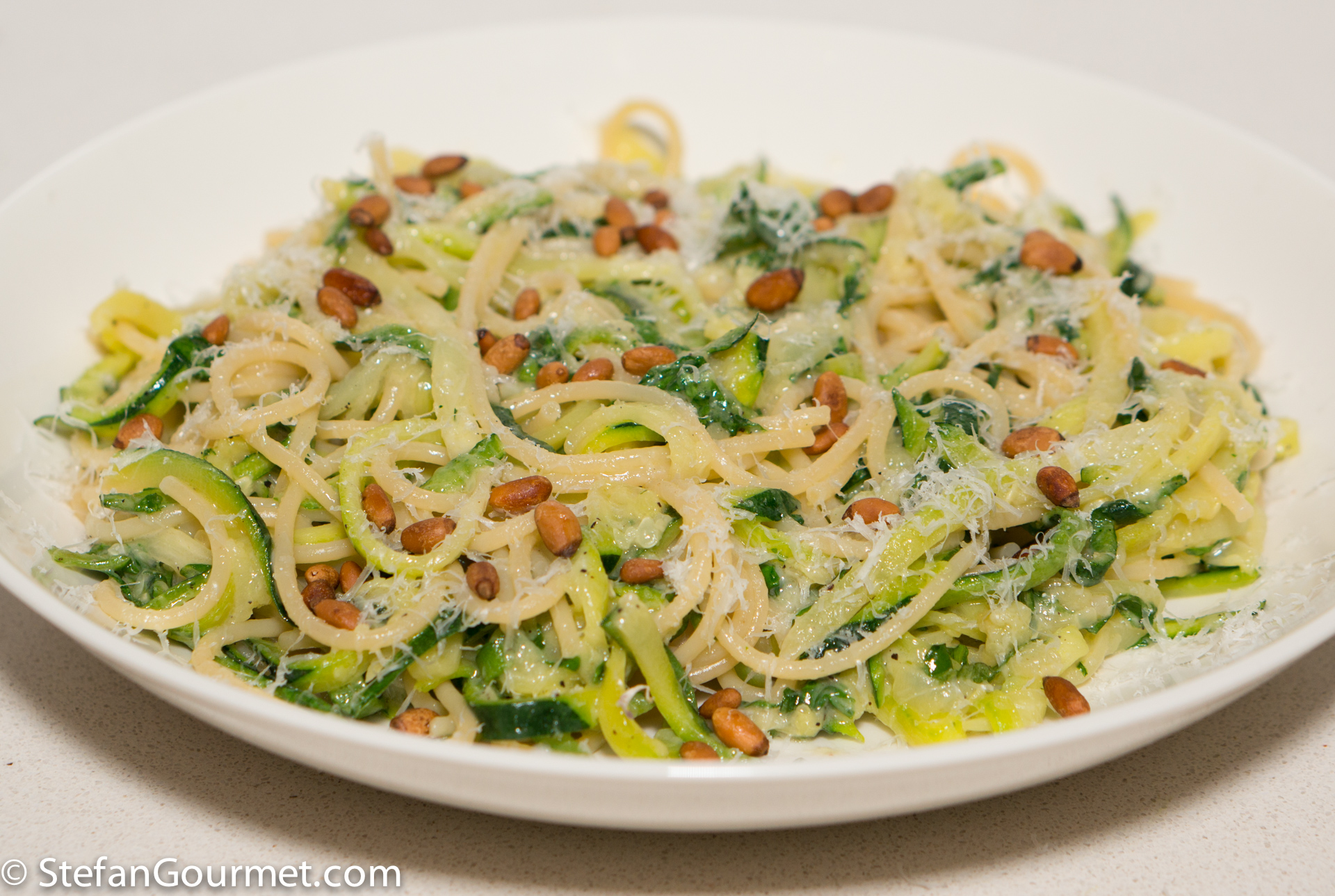 Spiralized Zucchini (also known as zoodles) are well known as a substitute for actual pasta, but I actually mix them with actual pasta and add ‘deconstructed pesto’ for a very tasty dish of tagliatelle (or spaghetti as in the photo) with spiralized zucchini, basil, toasted pine nuts, and parmigiano. This was our primo piatto, followed by: