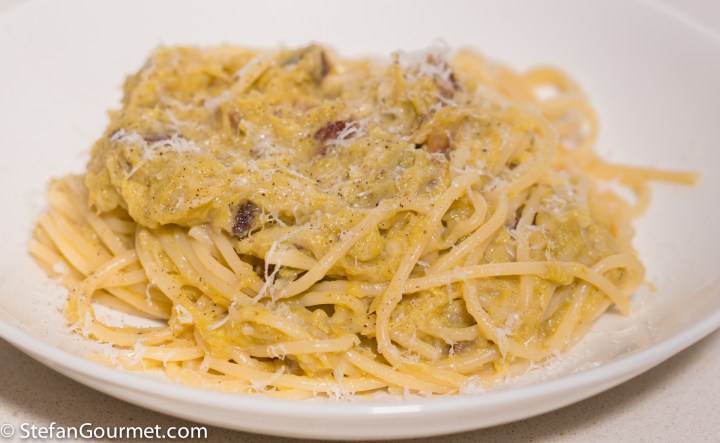 Spaghetti with sous vide leeks and pancetta can be prepared quickly by precooking and freezing the leeks, because cooking the leeks sous vide takes 2 hours. I make homemade pancetta every winter and keep it in single portions in the freezer.