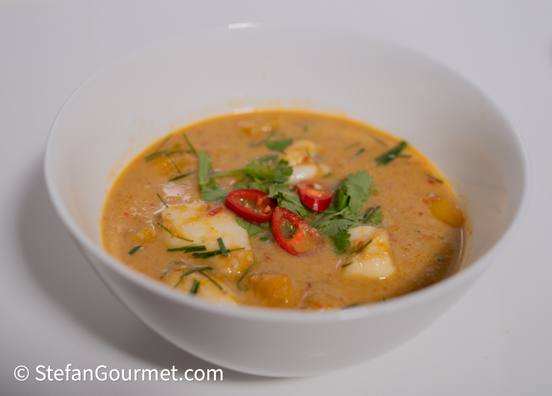 For this Thai red fish curry with squash, I often use homemade Thai red curry paste from the freezer. That way, it is ready in half an hour. Making the red curry paste fresh would add an additional 15 minutes or so, but most of the effort is in the shopping, because local shops do not carry all the required ingredients.