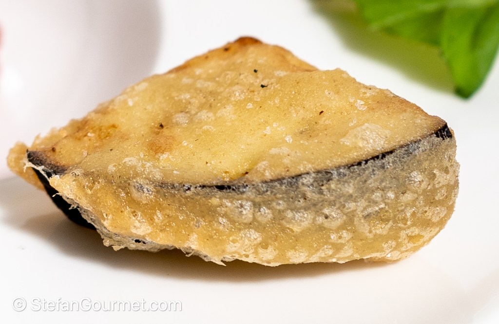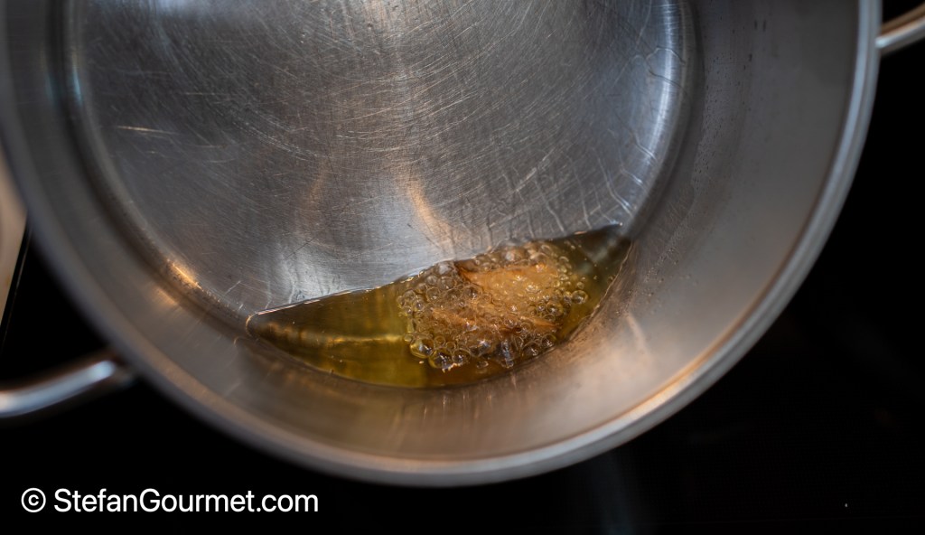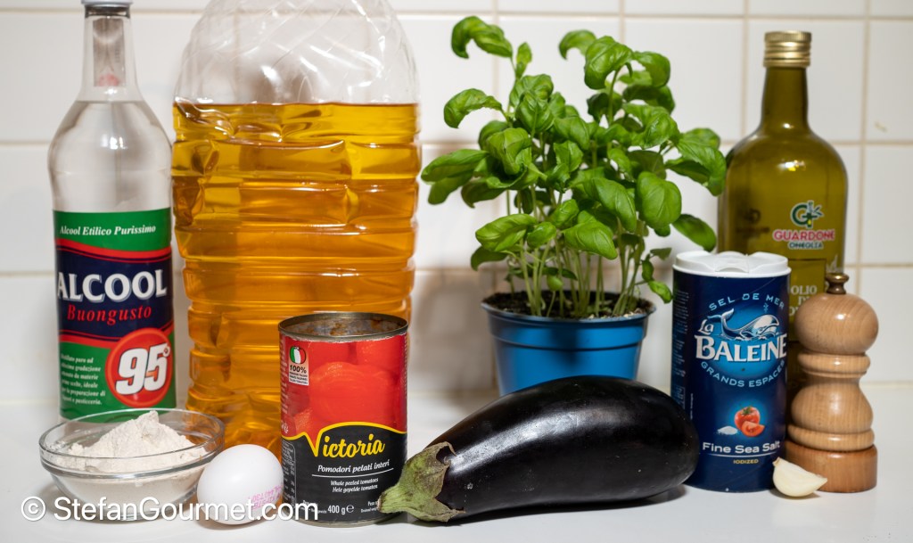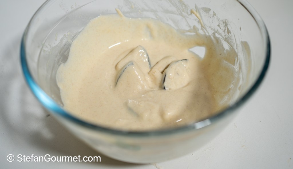 - The batter should be made with (cheap) vodka or sparkling water to get a lot of tiny bubbles from the stronger evaporation of alcohol compared to water (look at the close up photo to notice the bubbles). I used a mixture of half water and half 95% proof alcohol, as I didn’t have vodka in the house. The alcohol will burn off completely, so there won’t be any alcohol left when you eat the eggplant. It also helps to use flour with a low gluten content, such as cake flour.