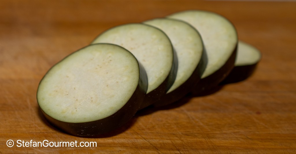 Cut the eggplant into slices of about 1 cm or 1/2 inch thickness.