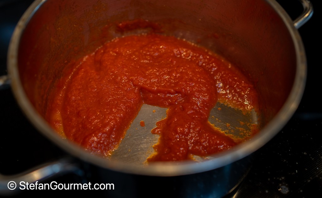 Simmer the tomato sauce over low heat until it is no longer watery, about 20 minutes. You can see in the photo that when you draw a line on the bottom of the pan with a spatula, the sauce is not leaking water. Taste and adjust the seasoning with salt and freshly ground black pepper.
