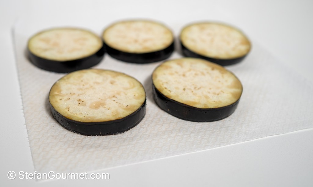 Place the slices on kitchen paper in a single layer, and season liberally with salt on both sides. Allow the eggplant slices to rest for an hour.