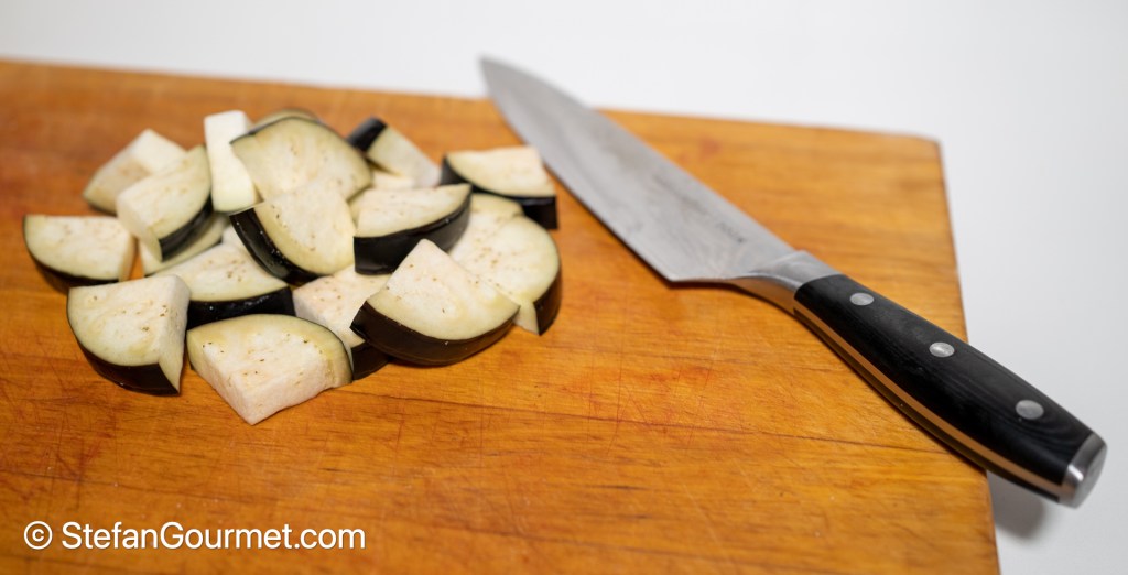 Allow the eggplant pieces to drain on kitchen paper, removing any excess oil from the top by patting with kitchen paper as well.