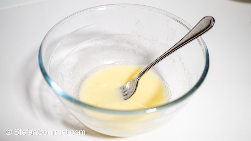 Do not make the batter long before you are going to use it, as you don’t want the gluten to develop (because gluten will make the crust tough). Beat the egg with 120 ml vodka until mixed.