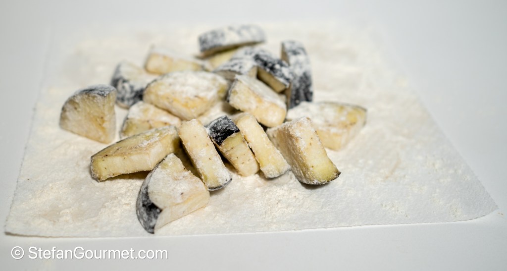 Toss the eggplant with flour.