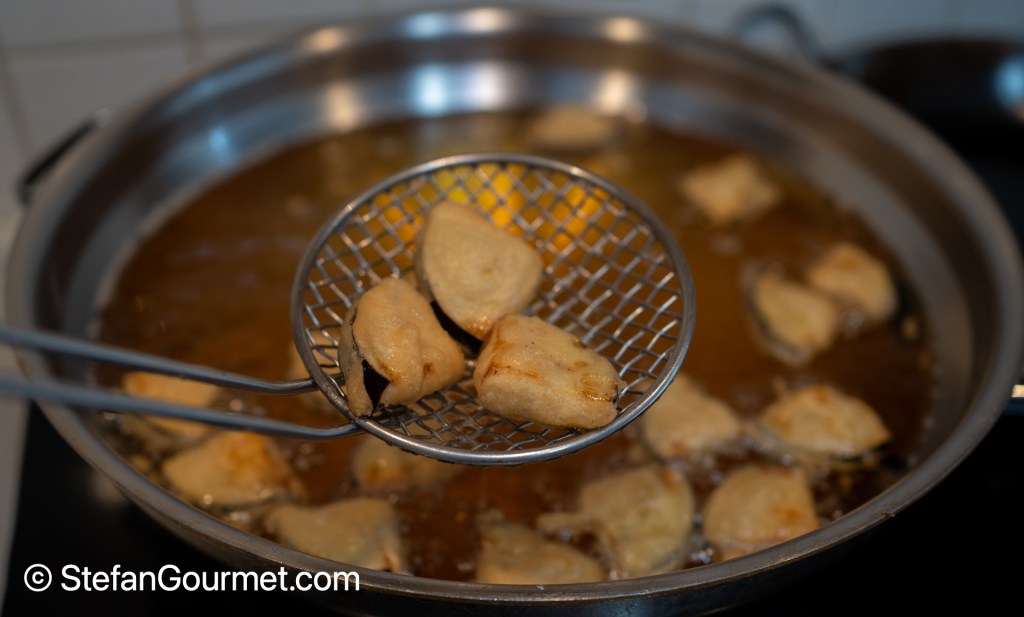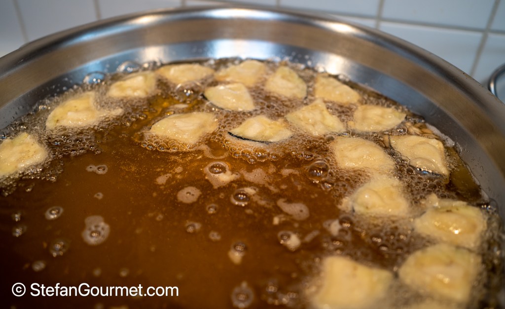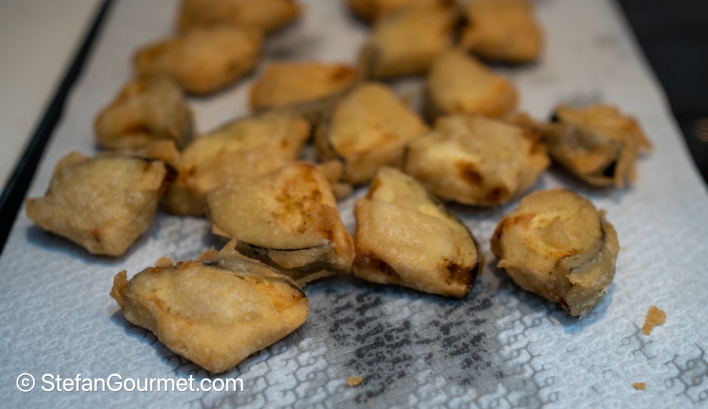 Make sure the oil is 180C/350F before adding the eggplant and try to maintain the temperature by not adding too much at once. Turn the eggplant pieces as needed until they are golden on both sides.