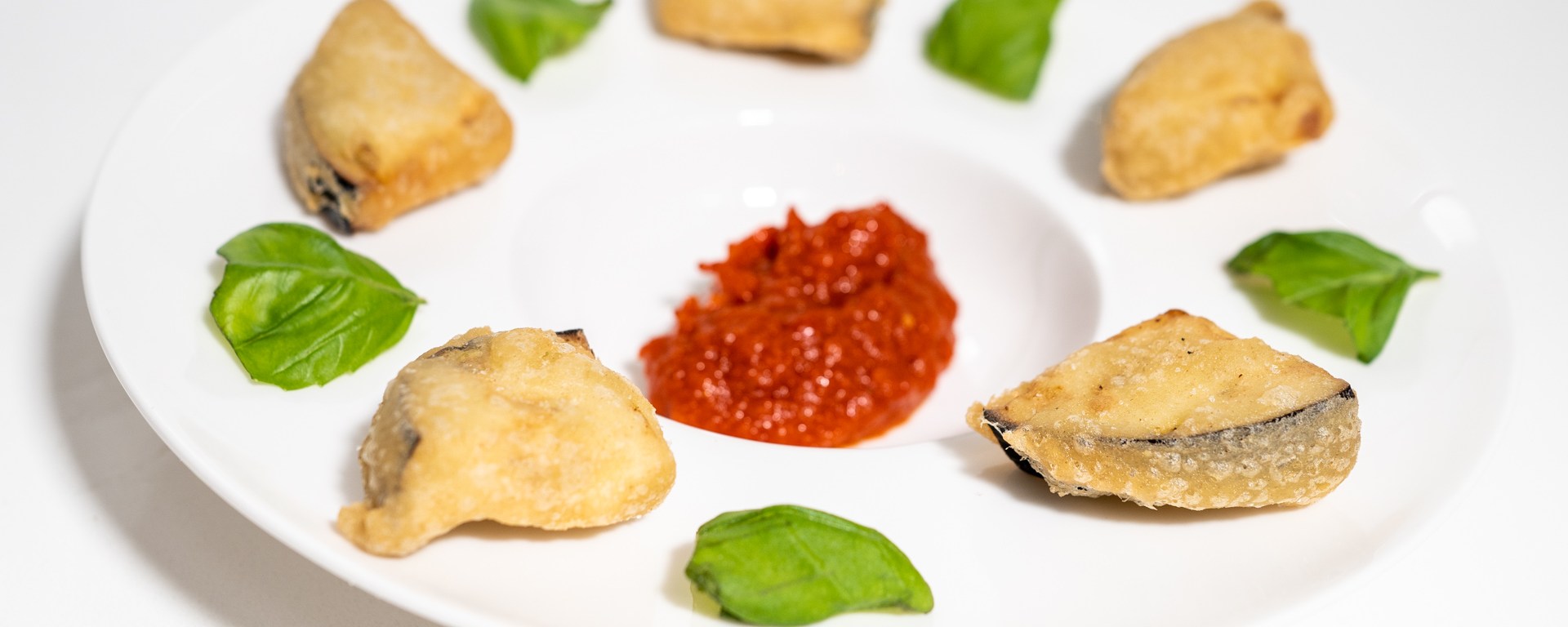 Serve the fried eggplant pieces with the tomato sauce as dipping sauce, with a basil leaf for each piece of eggplant. (If the basil leaves are large, tear them in halves or quarters.) Do not place the basil on top of the eggplant as that will make the basil wilt, but instruct your guests to take a basil leaf with each piece.