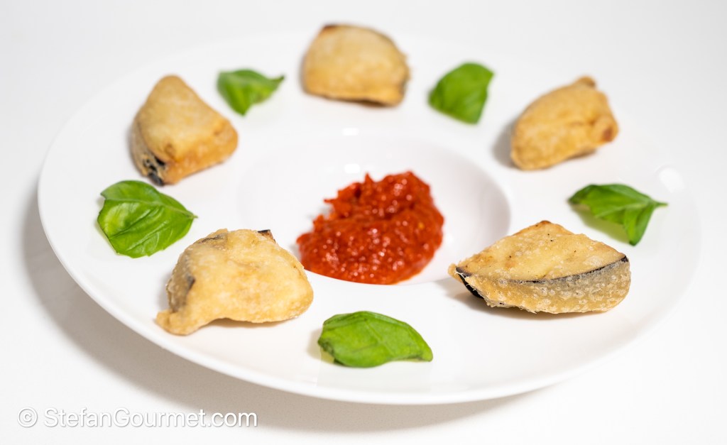 Melanzane fritte in pastella are slices of eggplant/aubergine dipped in batter and then deep fried until crispy on the outside and creamy on the inside. With some basil and tomato dipping sauce this is a lovely appetizer, that could also be served as hors d’oeuvres with cocktails.