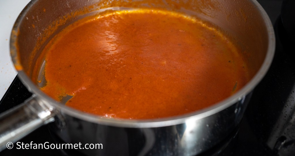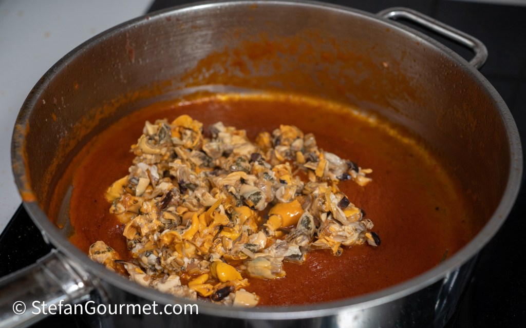 Simmer until the tomato sauce is nice and thick. Taste and add more mussel liquid (and reduce it again) until the sauce is salty enough. Season to taste with freshly ground black pepper.