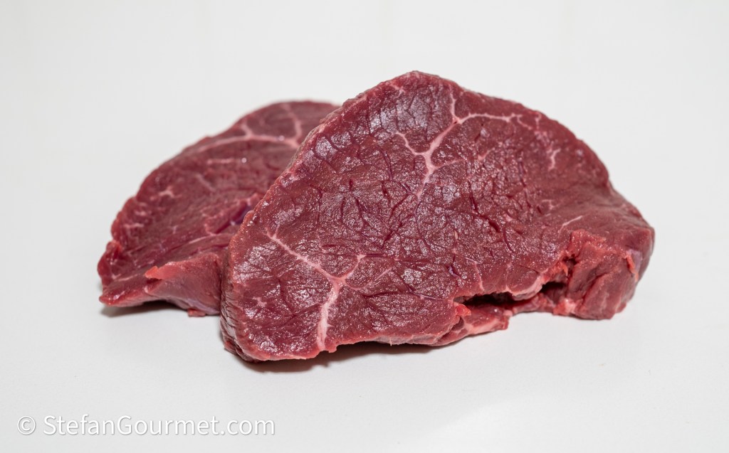 Slice the beef in steaks of about 2.5 centimeters/1 inch thick and then in long strips of the same width. Season them with salt and freshly ground black pepper on all sides.