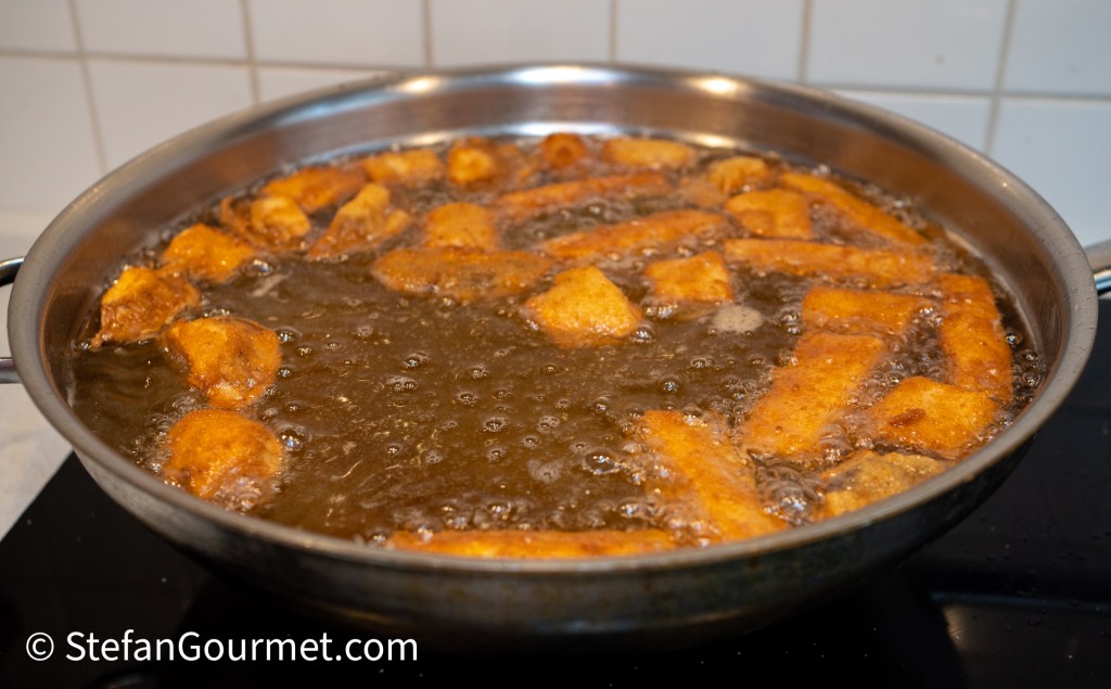 In classic Italian preparations the beef is deep fried when it is still raw, but precooking the beef sous vide has some advantages. By chilling the beef after sous vide cooking and then deep frying, the correct doneness of the beef is assured. The deep frying only serves to create the crispy outside and to bring the inside to serving temperature. When deep frying raw beef, it is more difficult to avoid undercooking or overcooking the beef at the same time as achieving a crispy golden brown crust. Another advantage is that the beef will already release the juices that will be released in any case by cooking the beef, which means that less juices will be escaping during and after frying the beef, thus keeping the crust more crispy. And finally, including some fresh rosemary in the pouch adds a very nice touch of rosemary to the beef.
