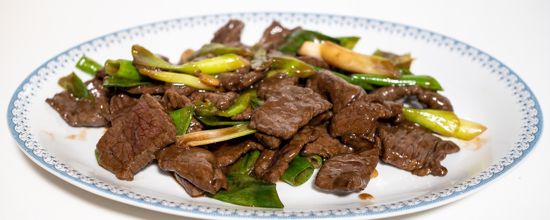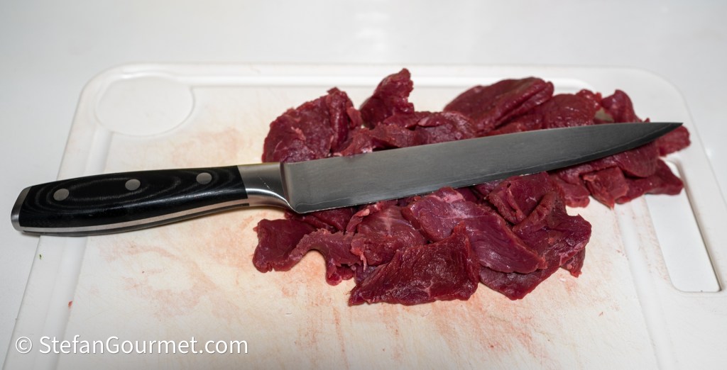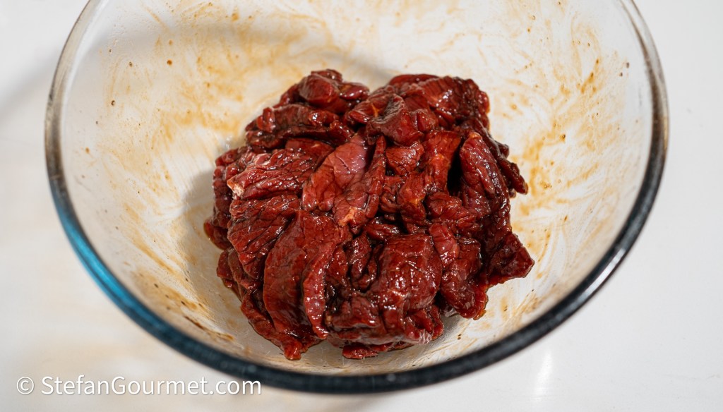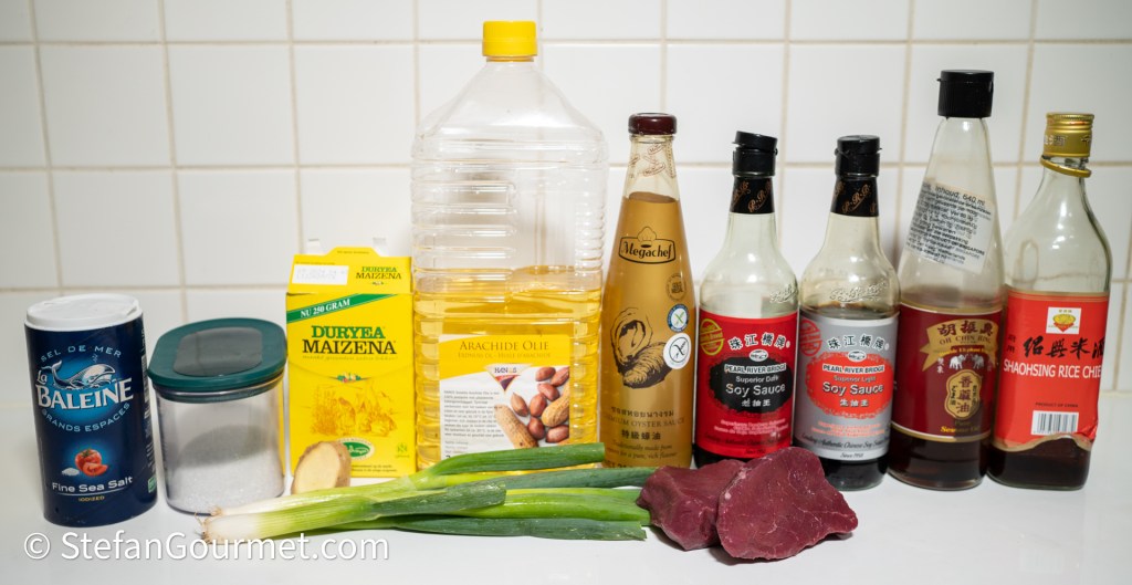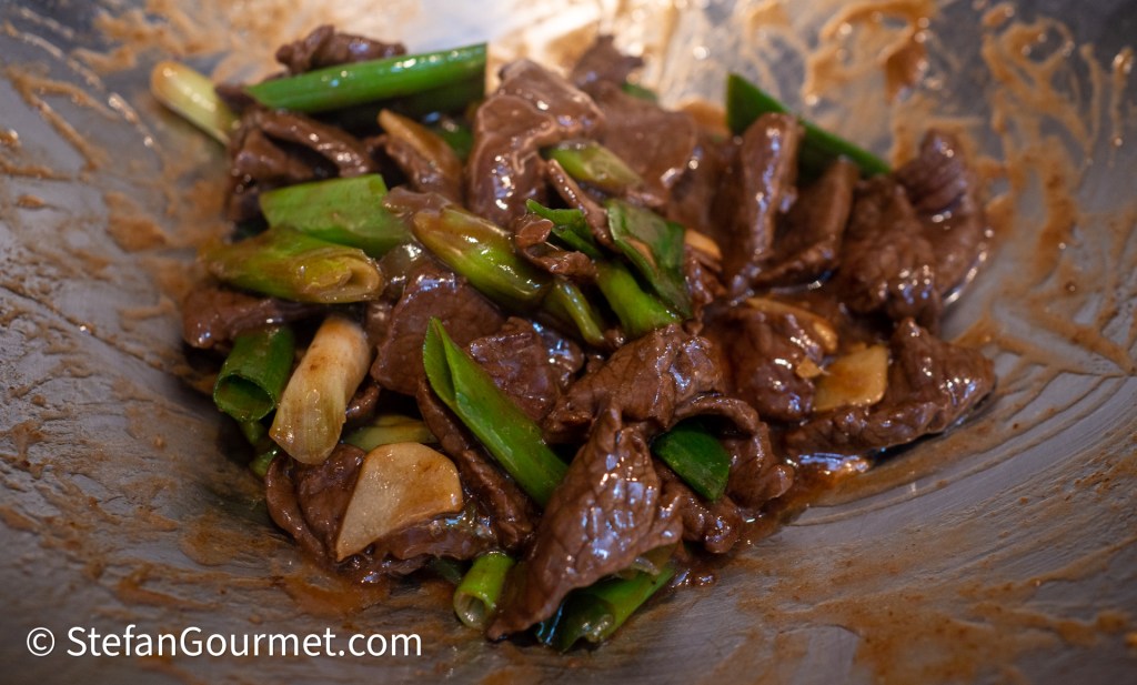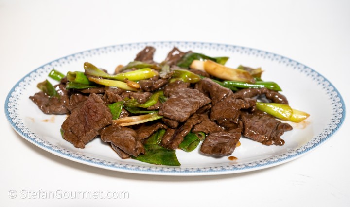 This dish looks and sounds very simple, but it requires a lot of ingredients and a lot of steps. They are worth it though. For this stir fried beef with ginger and scallions I used the recipe from Chinese Cooking Demystified. This is a great YouTube channel with detailed recipes for many Chinese dishes. If you follow this recipe, you can use beef that is quite tough and it will still turn out tender. The techniques used for this include marinating in water (!), slicing thinly against the grain, and ‘velveting’, i.e. passing the beef briefly through hot oil as a first cooking step. As the cooking has to be done very quickly, it was hard to photograph the steps without overcooking the dish.