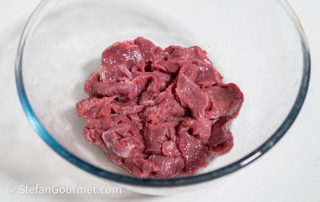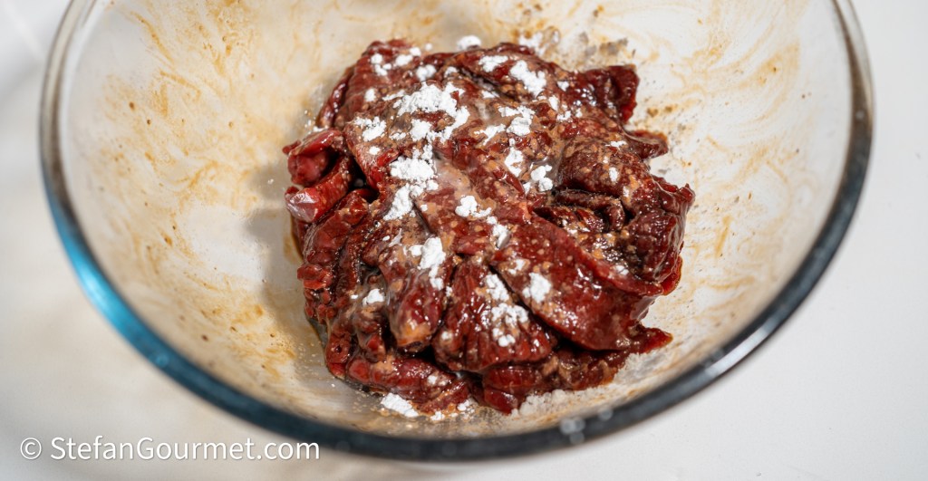 Add 1 tsp of cornstarch and 1 tsp of cooking oil, stir to mix. Allow to marinate for 30 minutes.