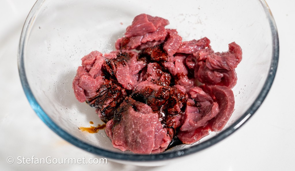 Add 1/2 tsp salt, 1 tsp sugar, 1 tsp shaoshing, and 1 tsp dark soy sauce.