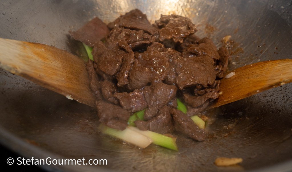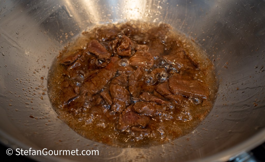 When the beef has finished marinating, heat an ample amount of cooking oil in a wok (at least 2.5 centimeters or 1 inch deep) to 160C/320F. Add 1/2 teaspoon of cooking oil to the beef and stir; this is to prevent the beef from sticking together when it is added to the oil. When the oil is hot, add the beef and stir for 10 seconds only.