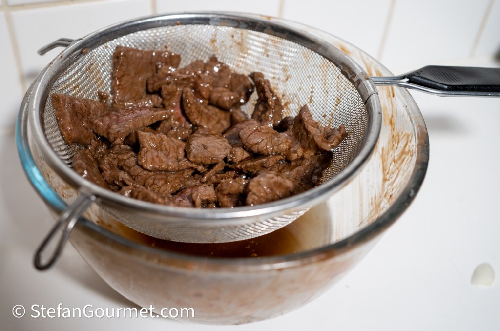 Take out the beef after those 10 seconds, and drain. Drain the beef in a single layer, so the residual heat won’t overcook the beef.