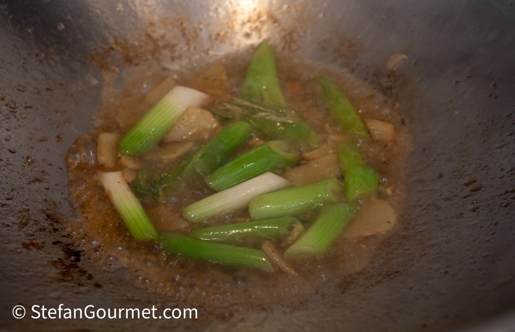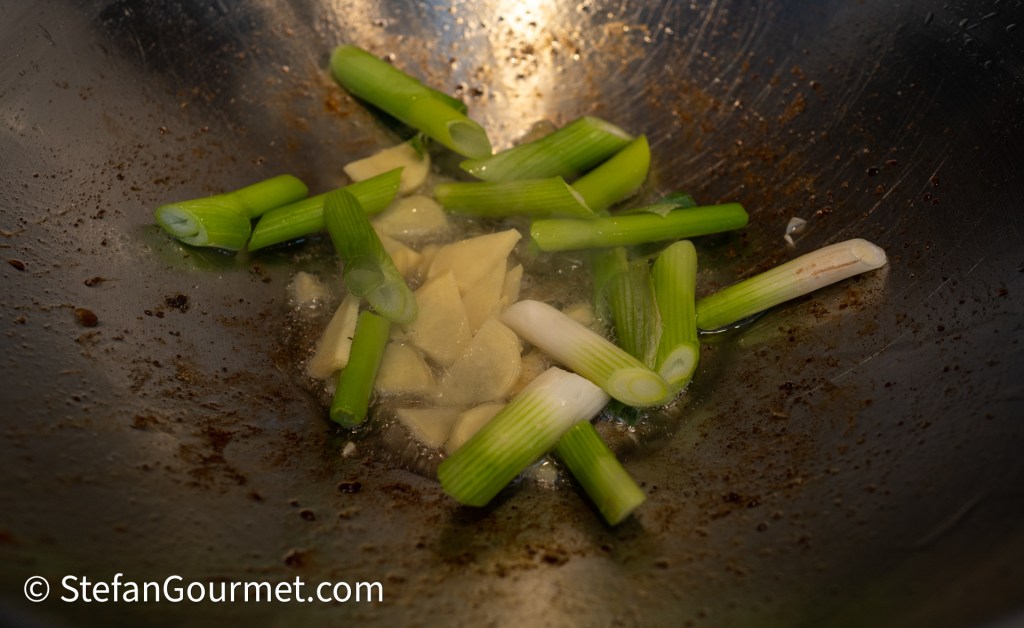 Pour most of the oil out of the wok, leaving only 2 tablespoons or so. Heat the wok, and when it is hot, add the white part of the scallions and the ginger.
