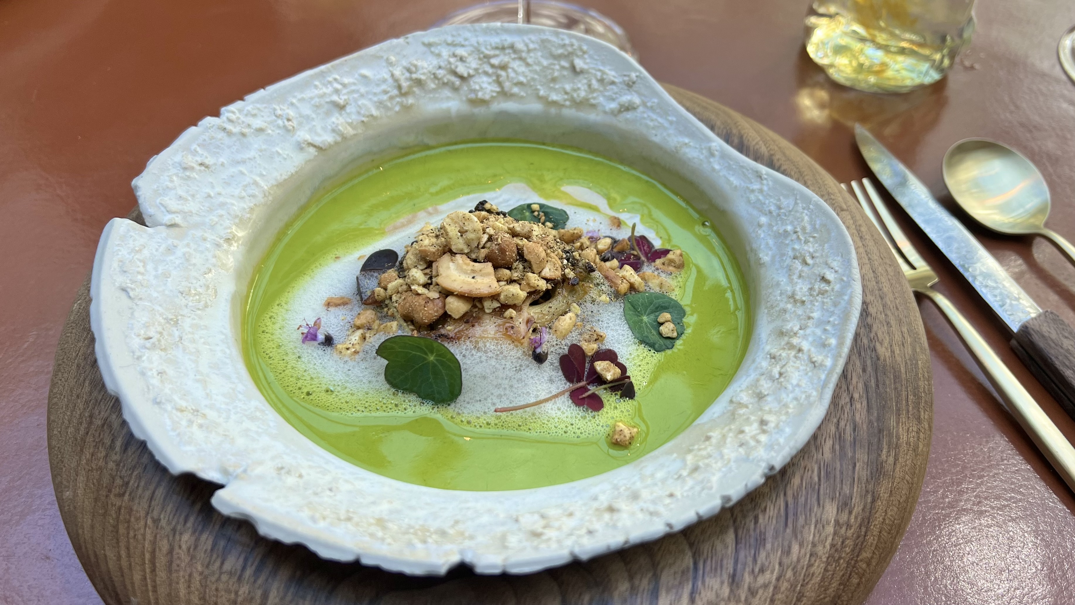 The first dish paired well with the Chardonnays was Romanesco green cauliflower, baked in clay in the oven, with a curry of Indian cress, coffee, and toasted cashews. Last year this was an experimental dish that we got as a bonus course, and this year it is on the menu. It was unchanged and as delicious as last year.